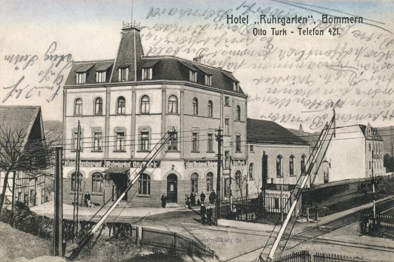 Der nachfolgende Ausschnitt einer vom Bergerdenkmal aus aufgenommen Postkarte zeigt das Gebäude-Ensemble, das sich nach der Eröffnung der Straßenbahn am Personenbahnhof Bommern entwickelte: in der Mitte erkennen wir das Hotel-Restaurant „Ruhrgarten“ mit dem angebauten Saal, rechts davon den Ruhrmannhof. Im Hintergrund ist ganz schwach Schloss Steinhausen angedeutet. Auch die Ruhrbrücke ist dank der sorgfältigen Arbeit eines guten Coloristen deutlich zu sehen. Rechts davon sehen wir den Kamin des Wittener Wasserwerkes (Verlag Cramers Kunstanstalt, Dortmund – Sammlung Ludwig Schönefeld).