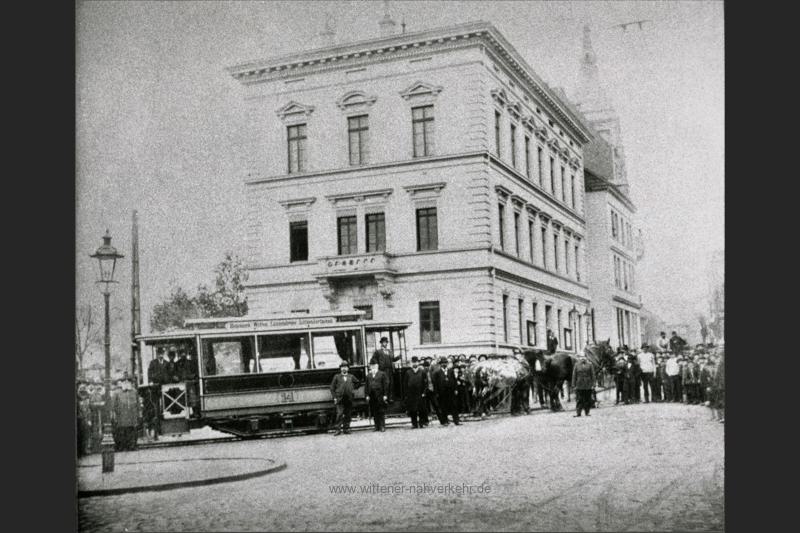 Das Beitragsbild zeigt die Anlieferung von Triebwagen 14, mit dem am 17. Oktober 1898 die Anlieferung des ersten Triebwagens der Märkischen Straßenbahn in Anwesenheit zahlreicher Ehrengäste vor dem Wittener Rathaus inszeniert wurde (A.-G. Elektricitätswerke – Sammlung Stadtarchiv Witten).