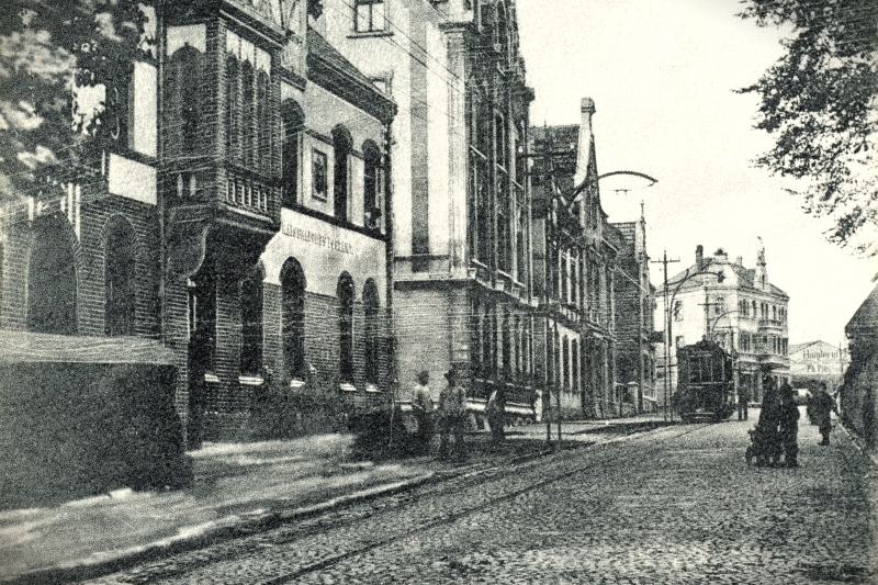 Aus der Kaiserstraße kommend lief das Gleis nunmehr in der Straßenmitte der Wilhelmstraße. Nur so konnte der für den engen Abzweig zur Bergstraße notwendige Kurvenradius realisiert werden.